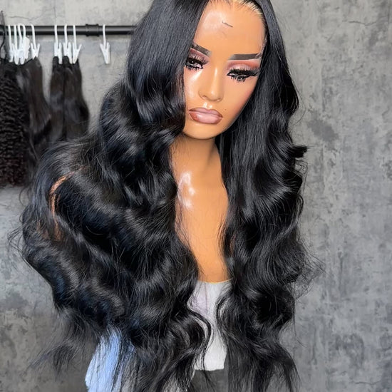 Middle part jet black closure wig. crafted with three 24" raw indonesian wavy bundles & a 5x5 HD lace closure. This unit is styled with soft beach waves.